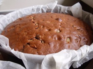 Do dzieła ! Owoce myjemy,obieramy ze skóry, usuwamy gniazda nasienne i kroimy w kostkę 1 cm x 1 cm. Kosteczki gruszki odkładamy na sito do odsączenia.Rodzynki moczymy w miseczce z rumem. Orzechy włoskie należy roztłuc na małe kawałeczki. Teraz ciasto.Całe jaja ubijamy blenderem (wysokie obroty) z cukrem. Kiedy masa jest już bardzo jasna (czytaj: ubita) dodajemy olej i dalej ubijamy.Kolejno dodajemy mąkę wymieszaną z proszkiem do pieczenia o sodą. Ciasto musi być dość gęste, żeby się nam owoce nie zatapiały. Kiedy masa jest już gotowa, dodajemy odsączone rodzynki i orzechy, a na końcu owoce. Całość delikatnie, ale dokładnie mieszamy łyżką (blender mógłby nam całkowicie zmiksować owoce).Przelewamy masę na blachę, wcześniej wyłożoną papierem do pieczenia. Rozgrzewamy piekarnik do temp. 180 stopni. Pieczemy około 50 minut. Po wyjęciu z pieca naszym oczom powinien się ukazać taki widok: