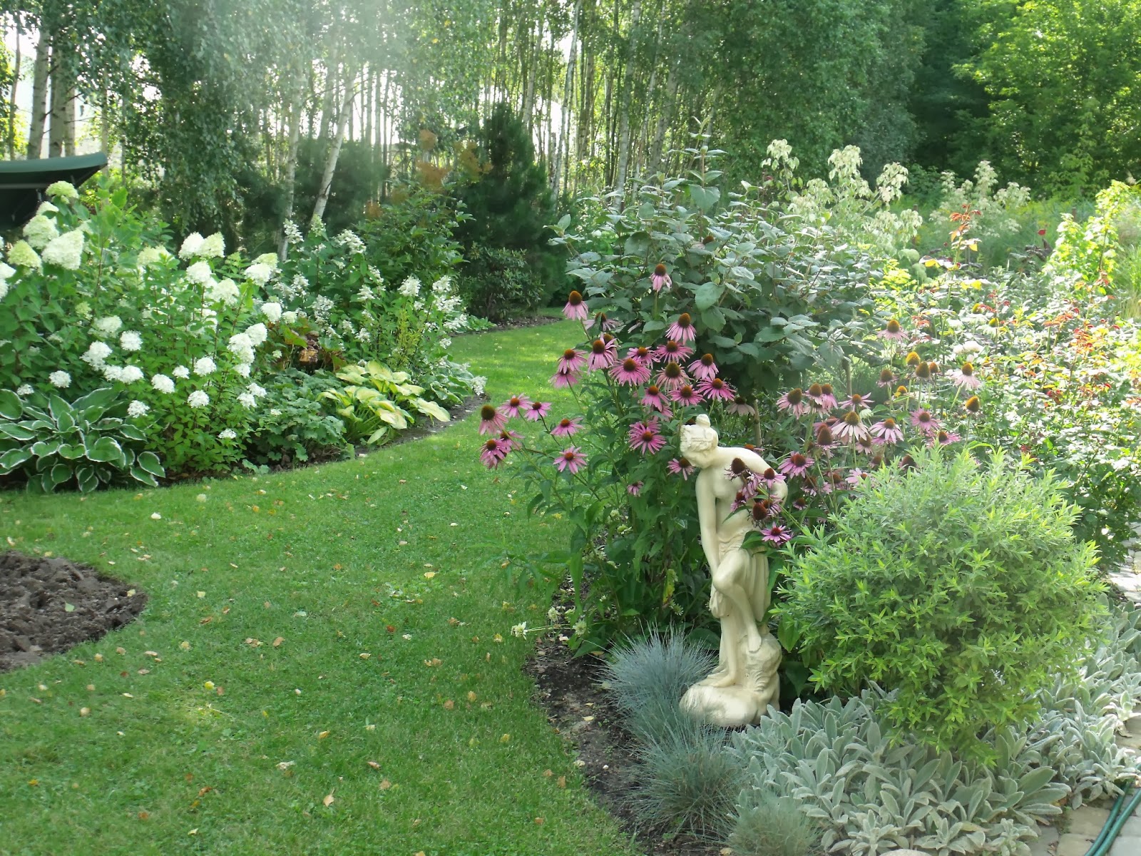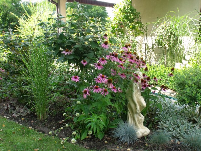 Nowy sezon, nowe pomysły i „przeprowadzka” Fredki. Od wiosny pochyla się nad roślinami na innej rabacie, otulona jeżówkami, z kostrzewą w nogach: