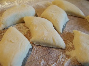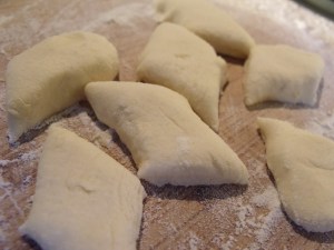 Może się jeszcze lekko kleić, bo w trakcie formowania wałeczków na desce posypanej mąką, ciasto jeszcze przyjmie troszkę mąki. Wałeczki kroimy z 3 cm rąby.