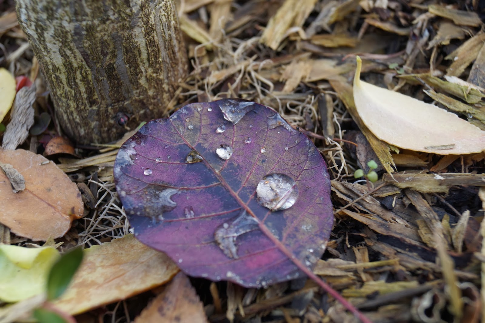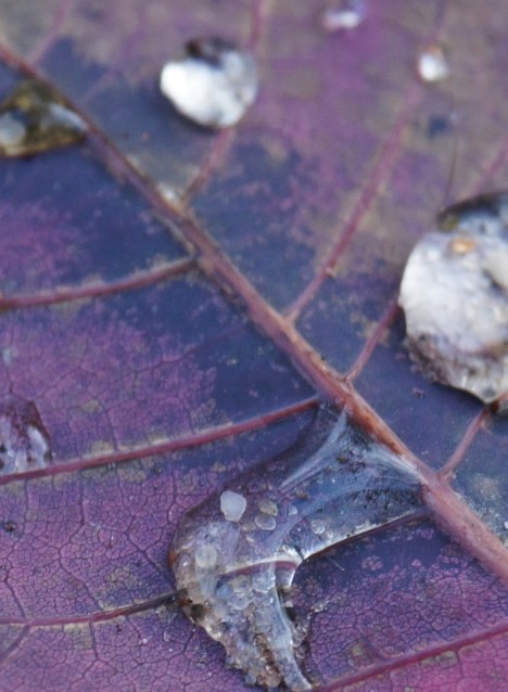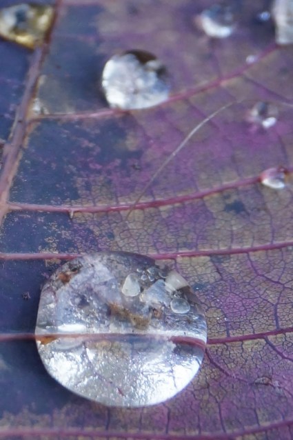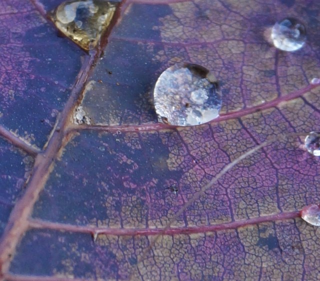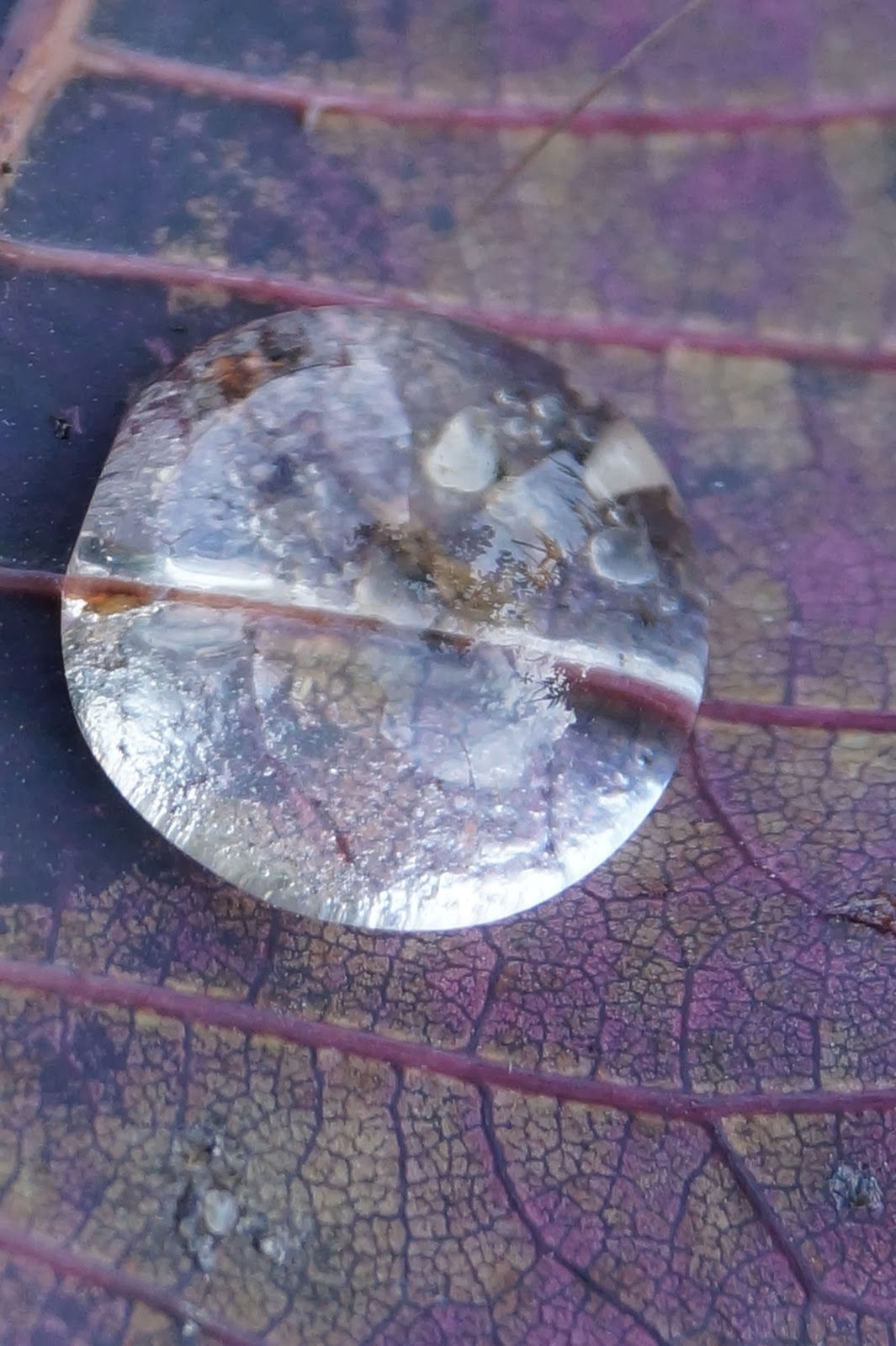To srebrna kropla, czy najprawdziwsza perła rosy ? Spotkałyśmy się podczas spaceru po ogrodzie. Odpoczywała na listku perukowca przy pniu trzmieliny. Całkiem dostojne miejsce wybrała na poranne spotkanie i krótki odpoczynek: