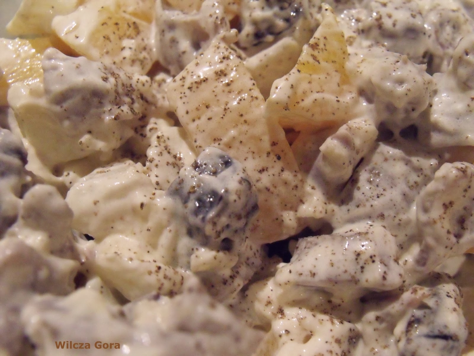 Jeśli trzeba jeszcze doprawiamy. Delikatnie mieszamy wszystkie składniki tak, aby sos dokładnie pokrył naszą sałatkę. Podajemy schłodzoną na liściach sałaty. Dobrze jej robią 2-3 godziny spędzone przed podaniem w lodówce.