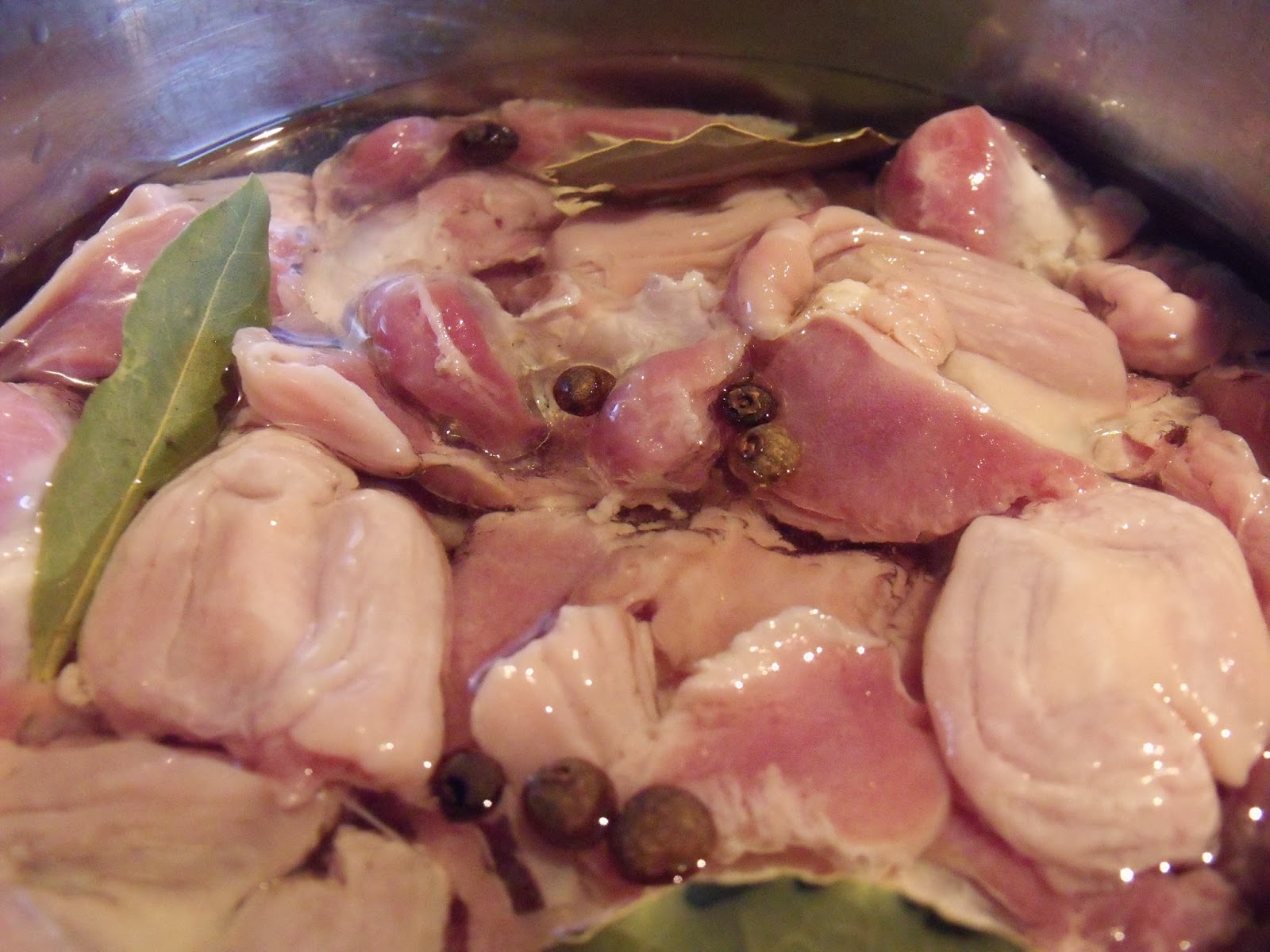 Umyte i oczyszczone żołądki zalewamy w garnku olejem, tak aby były całkowicie nim przykryte. Dodajemy przyprawy i gotujemy na małym ogniu około godziny. Odcedzamy i przyprawiamy pieprzem i solą. Ostudzone żołądki kroimy na cząstki. Teraz zabieramy się za resztę…