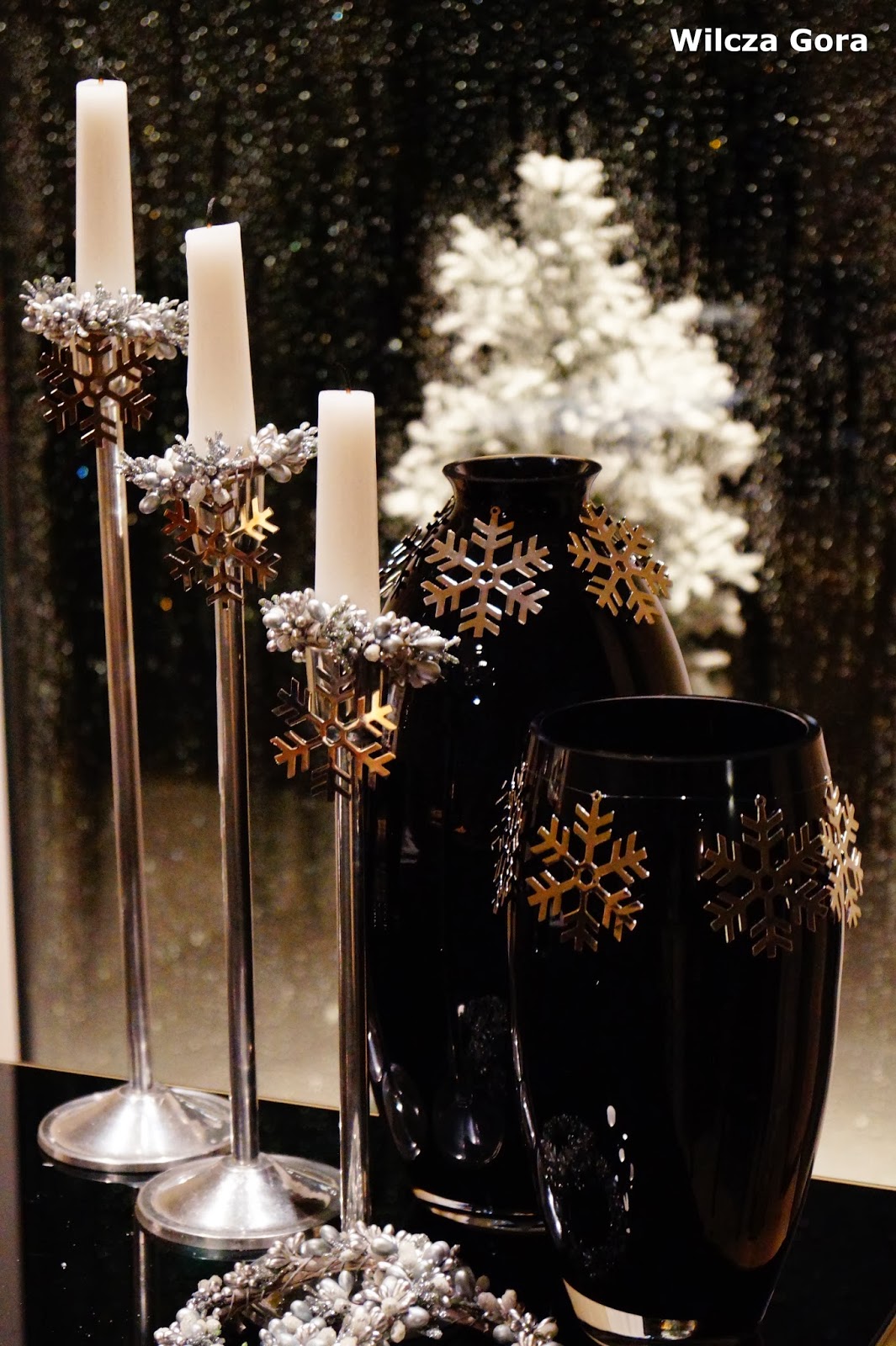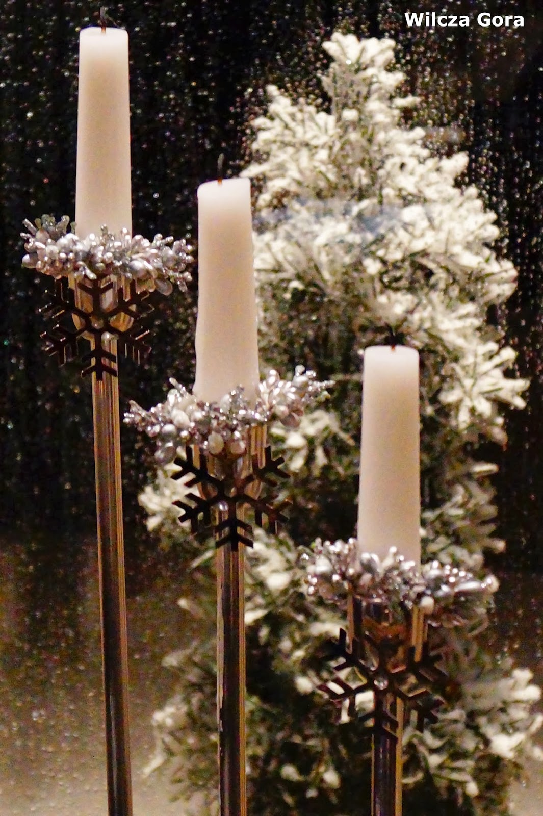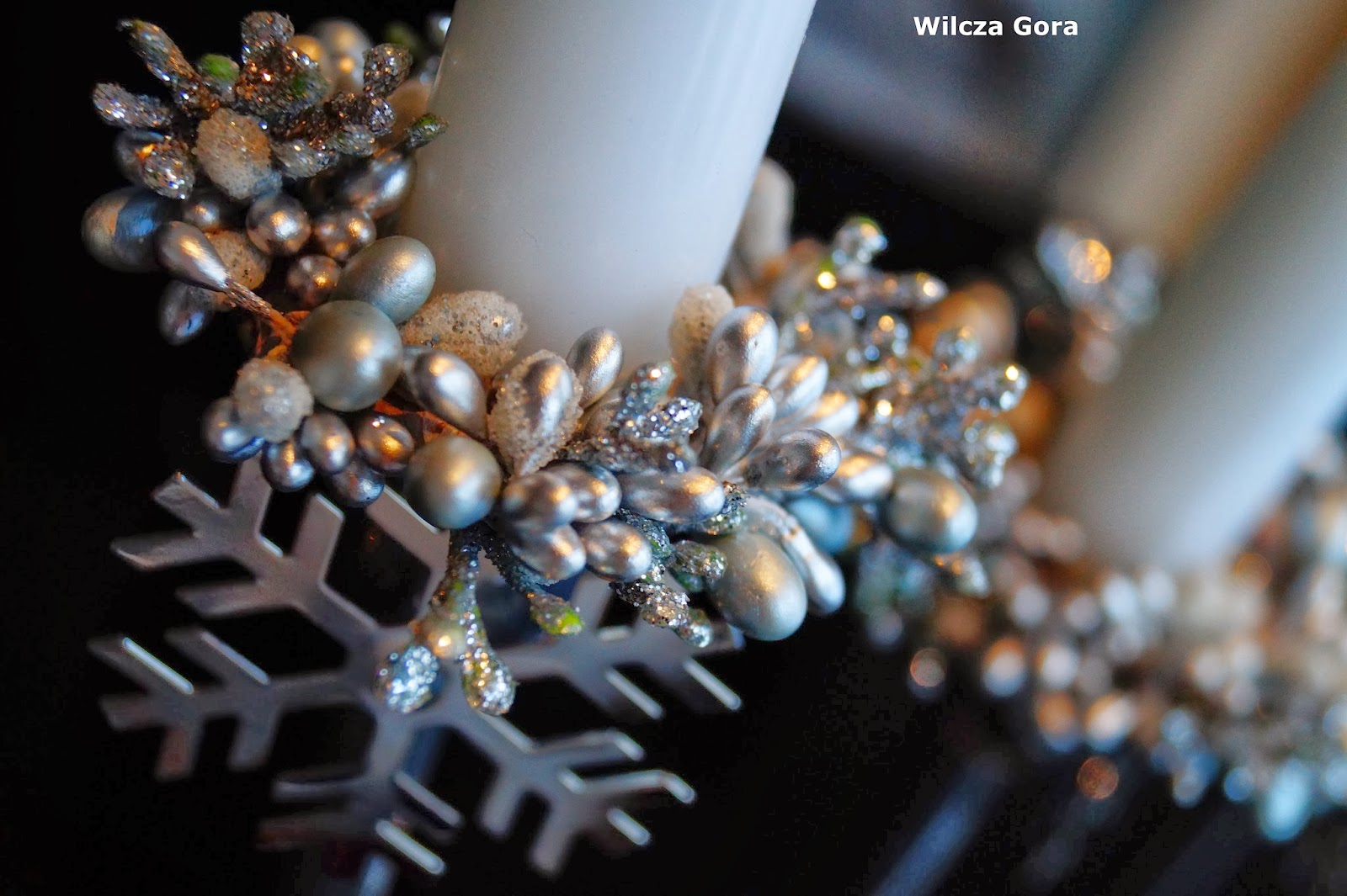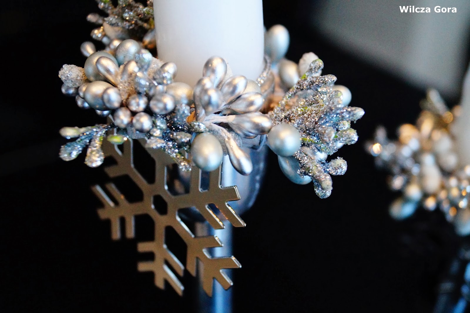 zawieszone na wazonach przy pomocy przezroczystej żyłki. Dostawiłam do nich 3 bardzo proste srebrne świeczniki.