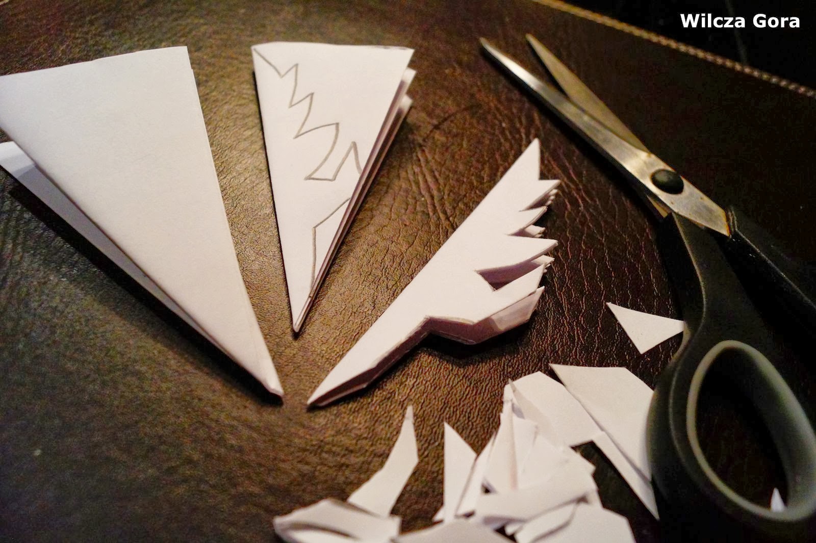 Ołówkiem rysujemy wybrany wzór śnieżynki (moja propozycja poniżej) i wycinamy: