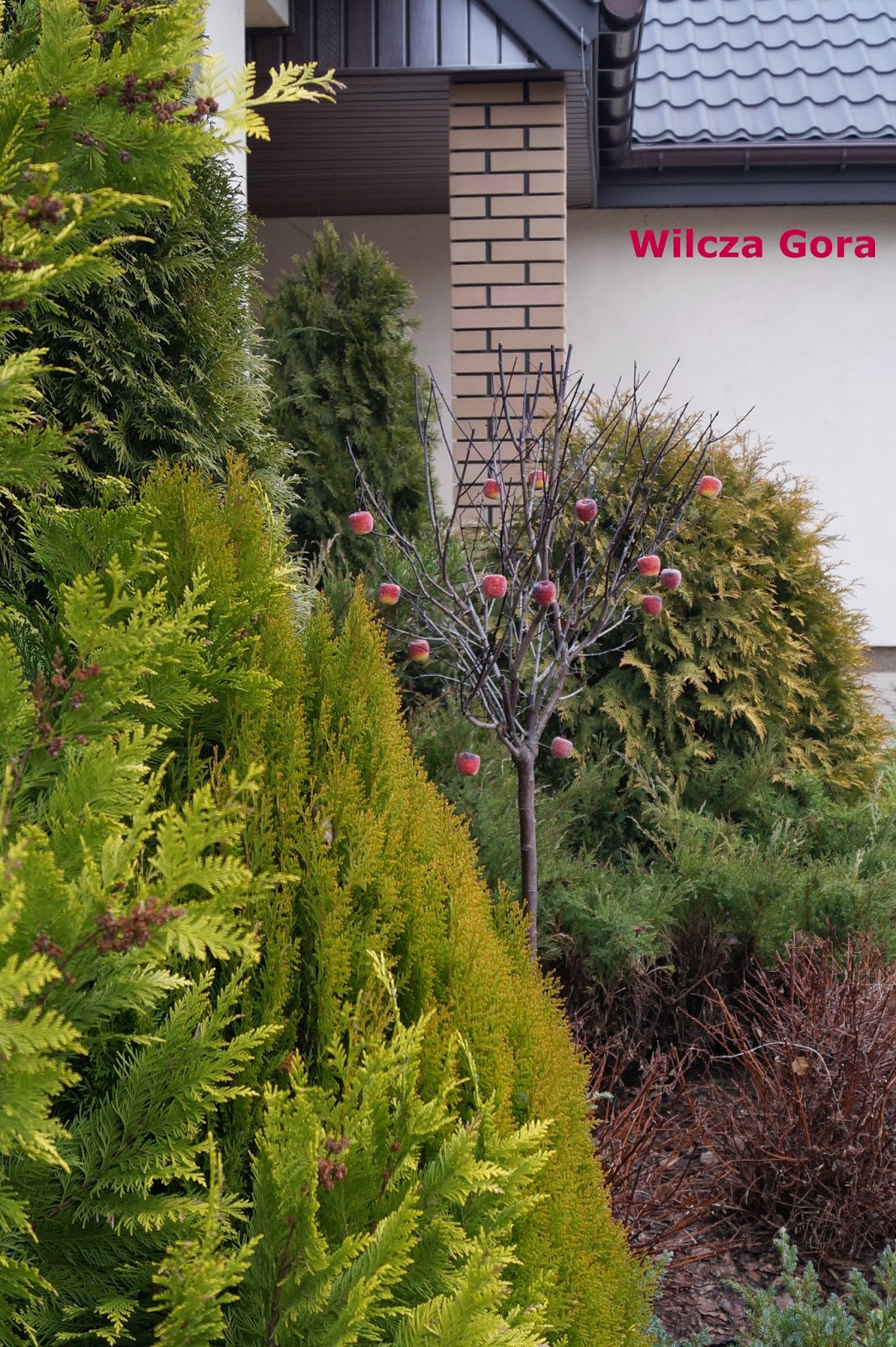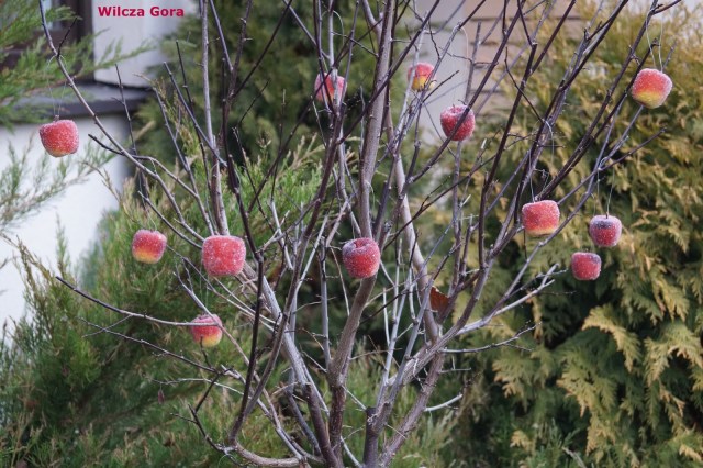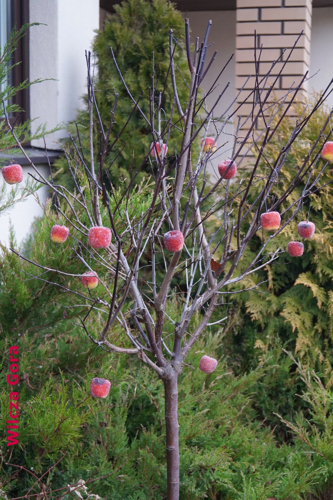 Dziś na małych drzewkach śliwy wiśniowej i klonu, powiesiłam „rajskie jabłuszka”.