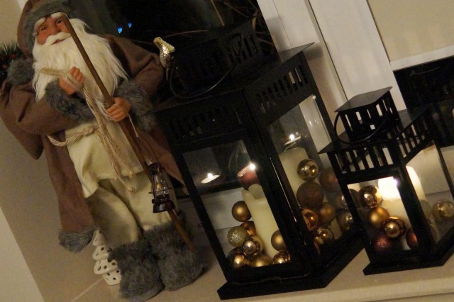Mikołaj już się wszystkim przedstawił 5 grudnia, kiedy schowany za kominkiem podglądał, czy jesteśmy grzeczni . Pamiętacie te zdjęcia ? Na czas Świąt przeniósł się na parapet, gdzie stoi w towarzystwie lampionów, pełnych świec i bombek. Takie świąteczne lampiony widziałam na pięknym kanadyjskim blogu, już wiele lat temu, a u nas zagościły dopiero dwa lata temu. Już wiem, że bardzo za nimi przepadam, będzie to ozdoba naszego domu na dłuższy czas.
