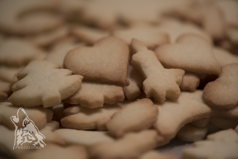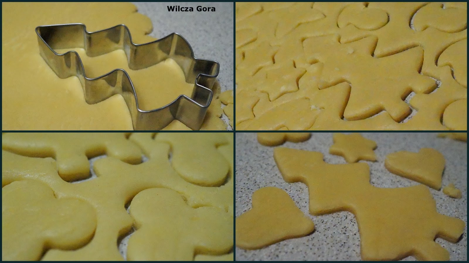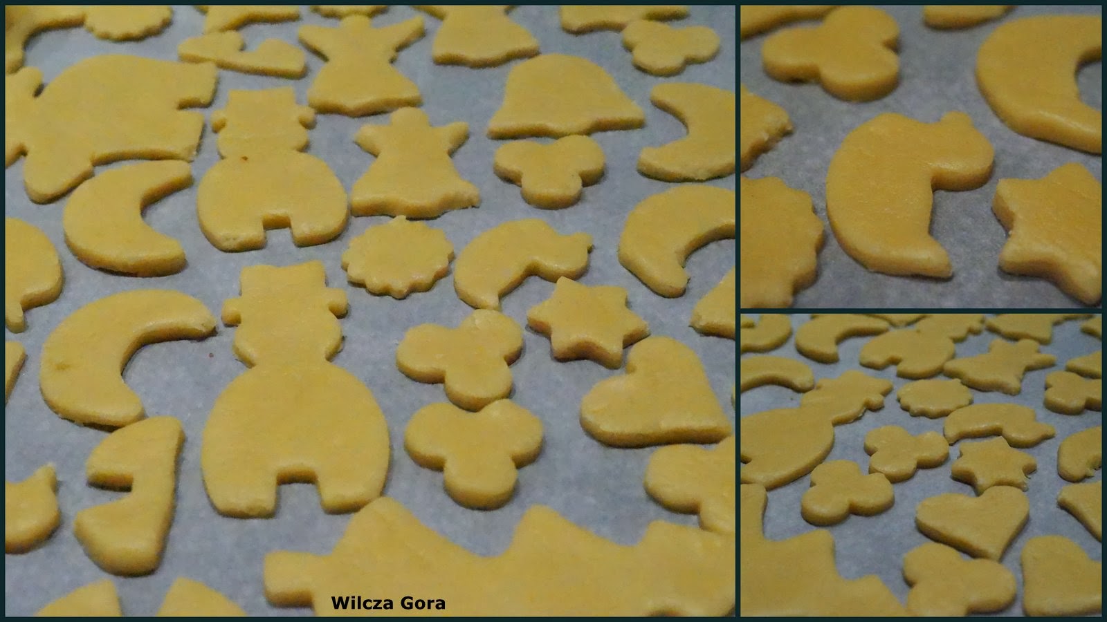 Do miski wsypujemy całą mąkę, proszek do pieczenia, cukier, cukier waniliowy i pokrojone w kostkę masło. Kolejno dodajemy jaja i żółtka, na końcu śmietanę. Całość zagniatamy do momentu uzyskania jednolitej masy. Kolejno, według własnych upodobań i możliwości wykrawamy ciasteczka: