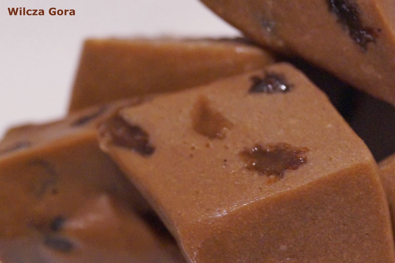 Dla chętnych, którzy lubią czekoladę z rodzynkami, a najlepiej pachnącą jeszcze rumem…polecam namoczyć garść rodzynek w rumie lub ulubionym likierze. Odsączyć i dodać na sam koniec do gotowej masy. Dzielę gotową masę na dwie części. Jedną „alkoholową” a drugą „abstynencką”. Obie wylewam na papier do pieczenia, ułożony na płaskich talerzach. Po przestudzeniu, wkładam czekoladę na 1 dobę do lodówki. To bardzo ważne! Wcześniej, będzie się źle kroiła (będzie zbyt miękka).