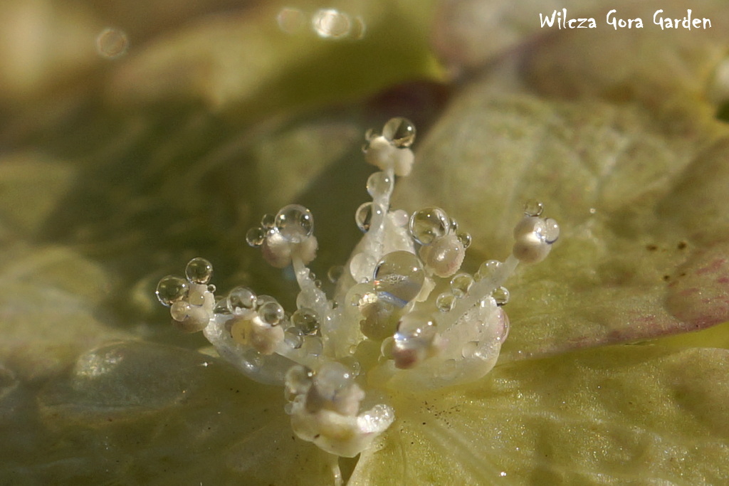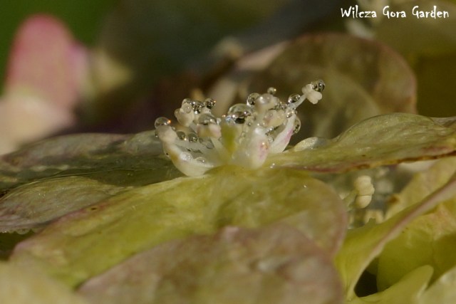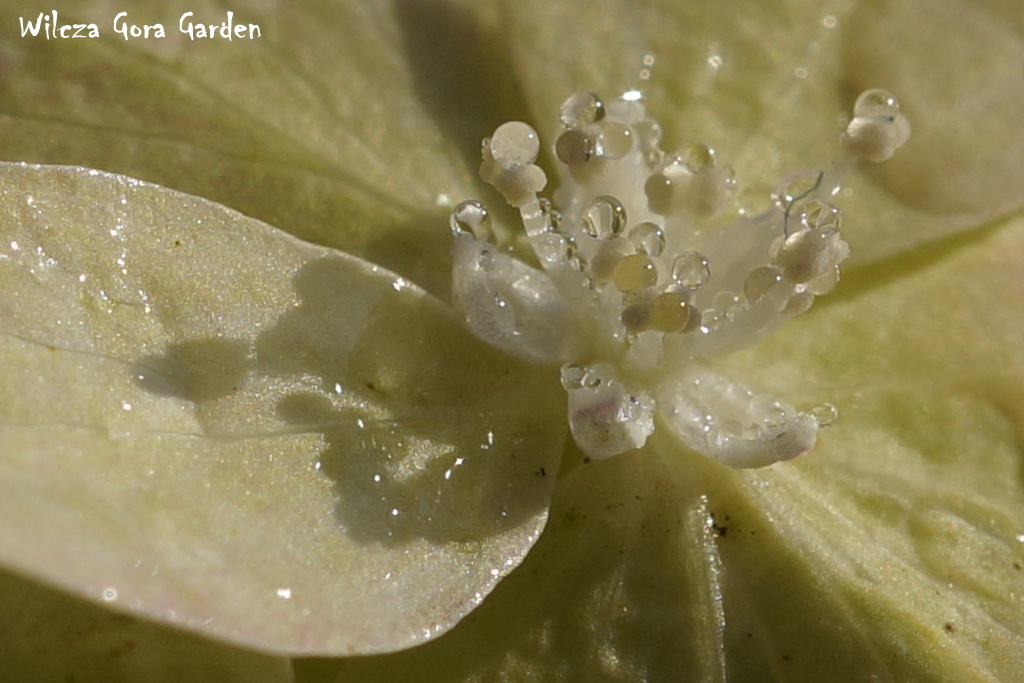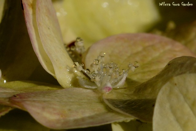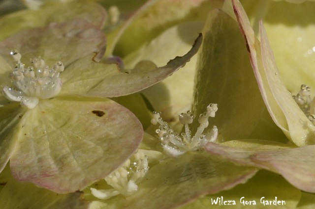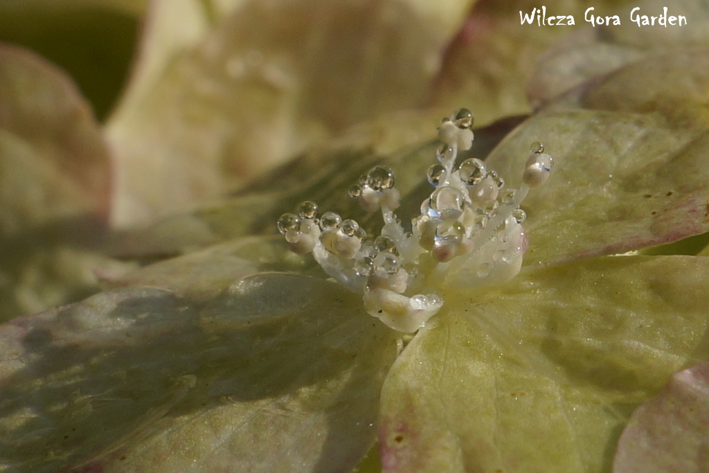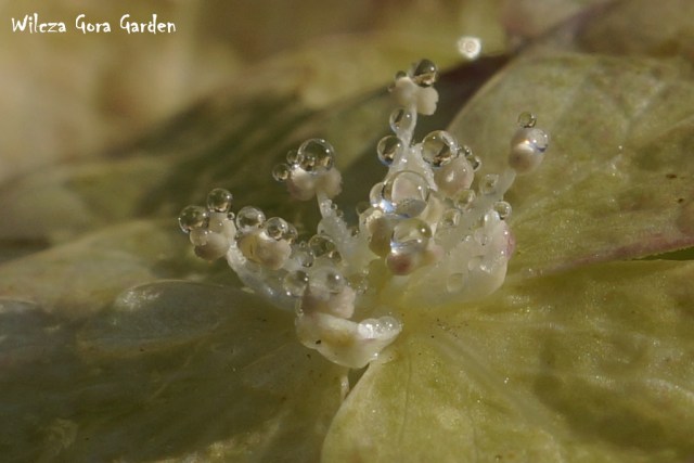 „Kto rano wstaje … (…)” – i ja dostałam. Poranna, wszechobecna rosa stworzyła tak niezwykłą i przepiękną choreografię na moich ukochanych hortensjach bukietowych. Każdy kwiat zbudowany z przeogromnej ilości małych kwiateczków z jeszcze mniejszymi środeczkami i pręcikami. Założyłam największy obiektyw i przyjrzałam się z bliska jaką biżuterię tego ranka przybrały, w jakiej galanterii witają tak piękny, słoneczny dzień.