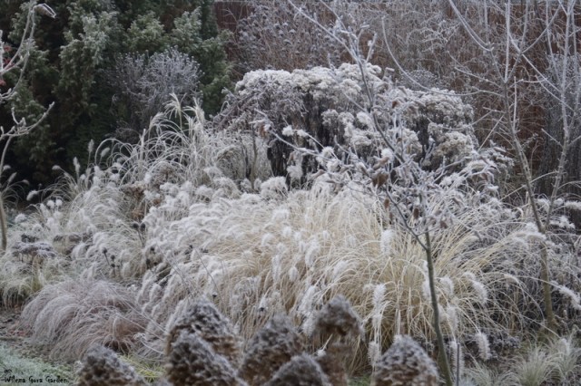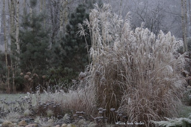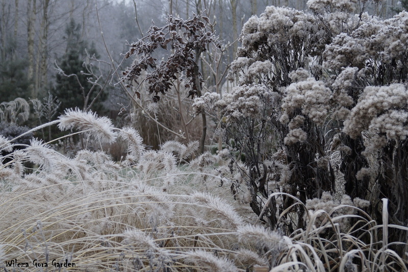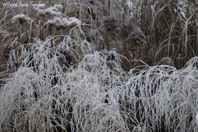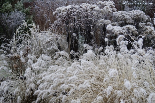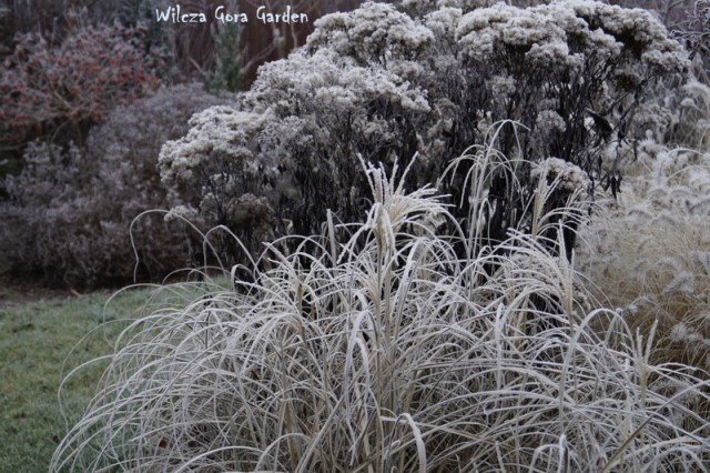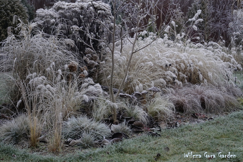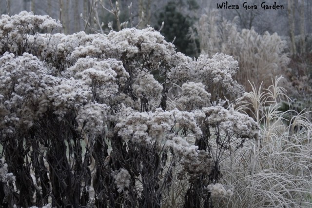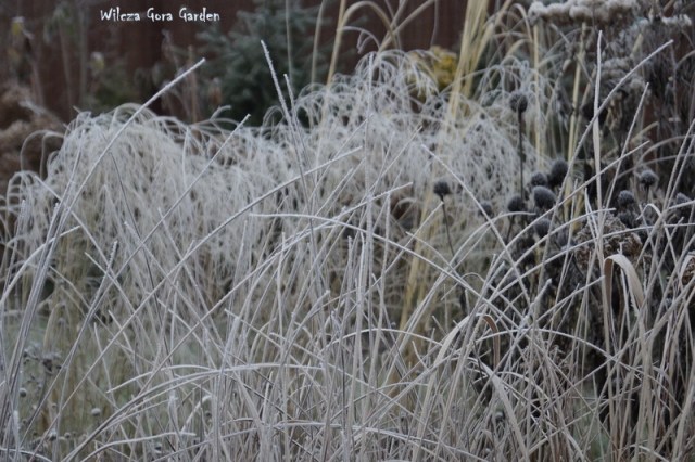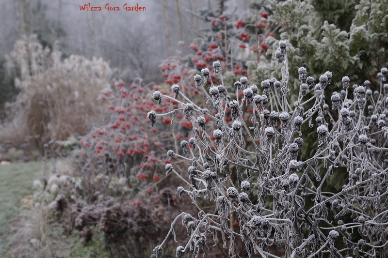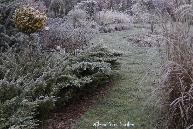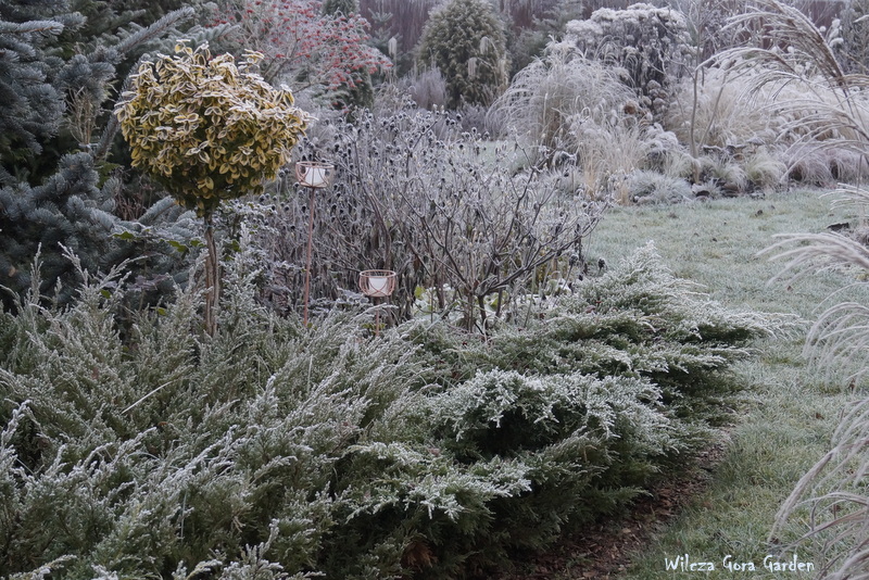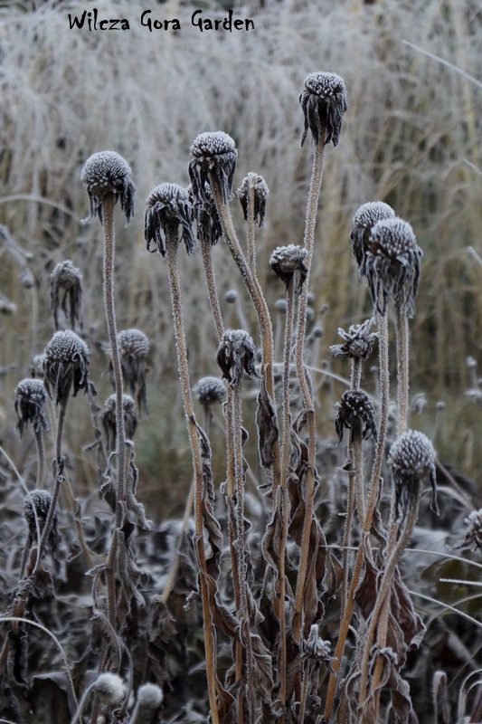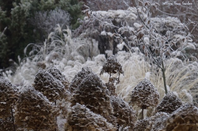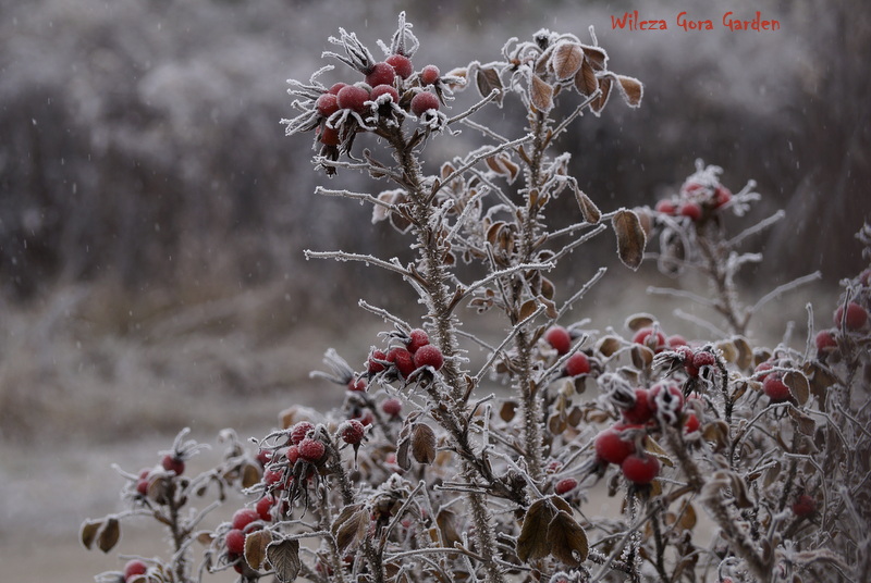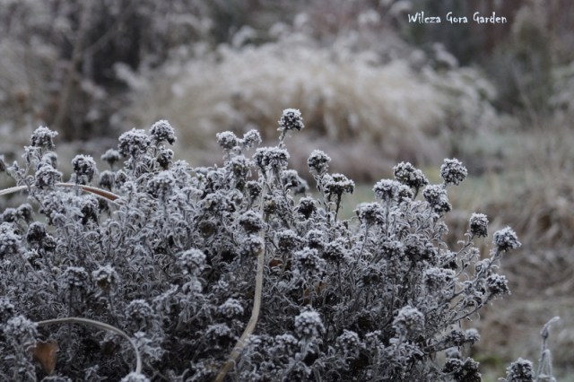 Po wielu bardzo ponurych dniach….i tu powinnam napisać: „zza chmur wyszło słońce”, ale nie. Nie mogę tak napisać, bo nadal jest ponuro. Zmieniło się tylko to, że ogród pokrył się pięknym białym szronem. Nocne przymrozki, utrzymały się do wczesnych godzin porannych. Padał nawet drobny śnieżek. Oto dowód: