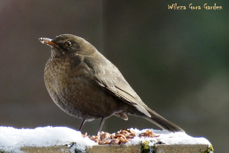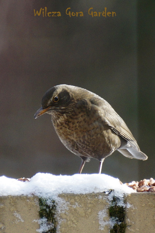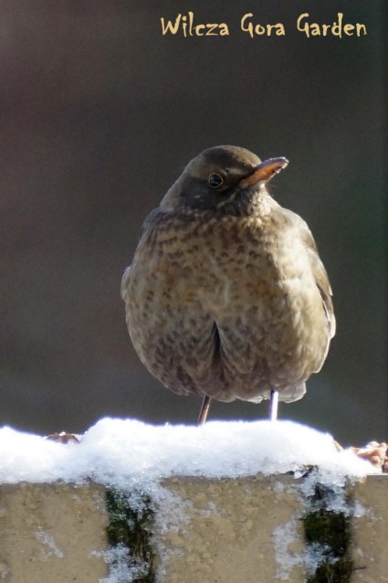 Samica kosa. Pilnuje orzechów i resztek łupin, posilając się co chwila. Kilka dni temu, słońce było tak łaskawe