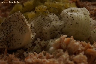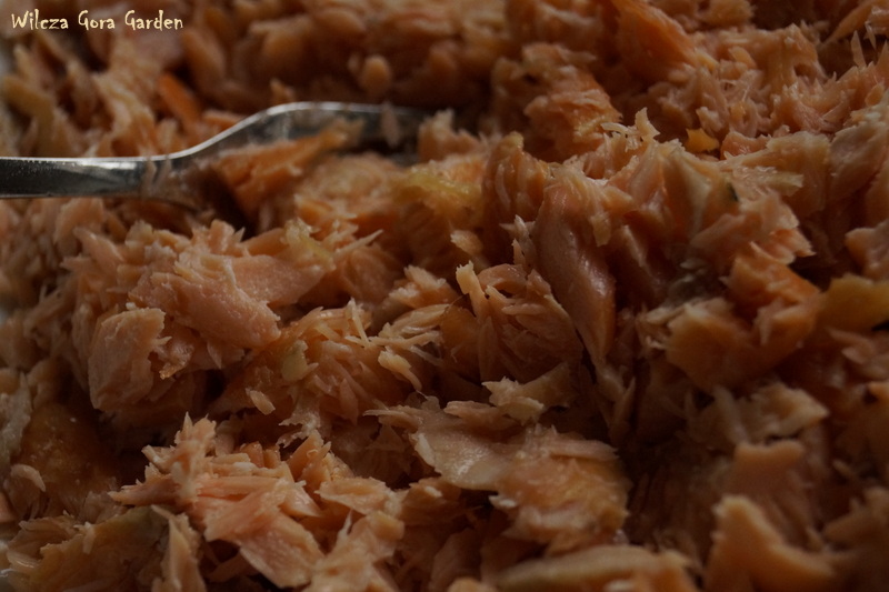 Łososia pozbawiamy skóry i wszystkich ości. Ja robię to przy pomocy widelca, którym rozdrabniam kawałki i jednocześnie usuwam ości.