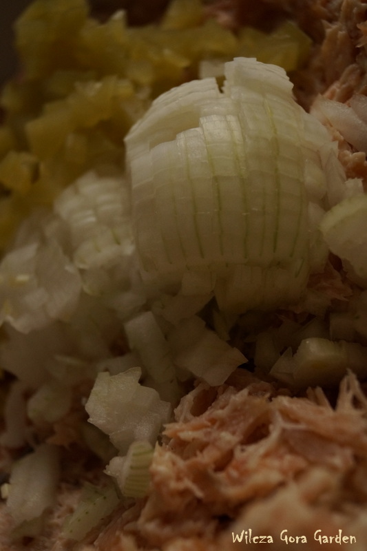 Cebule i ogórki kroję w drobną kostkę.