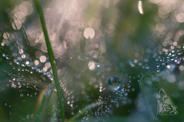 Jeśli pojawicie się w ogrodzie nad ranem, kiedy poranne, majowe słońce jest jeszcze bardzo nisko, spotkacie małe pajęczynki, pełne rosy: