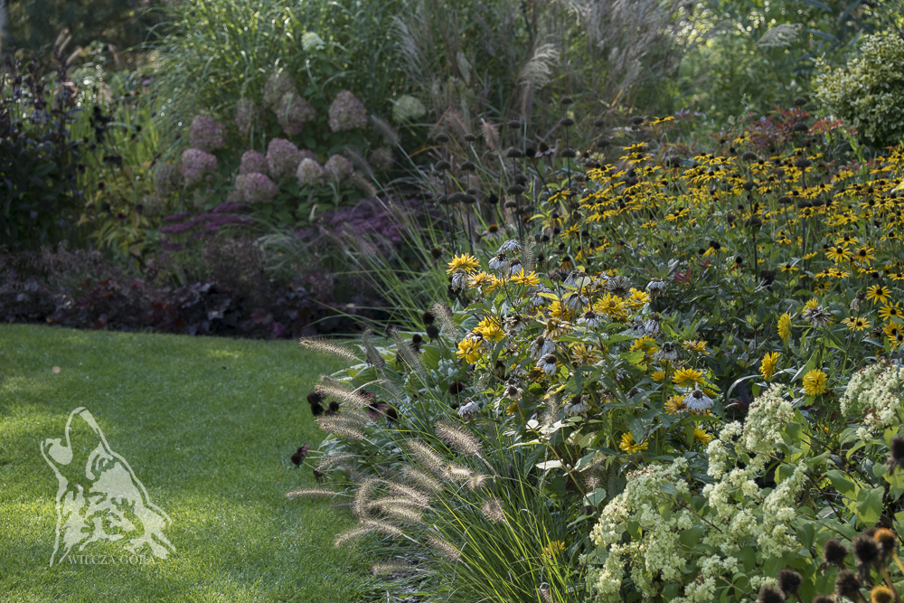 Słoneczna rabata z rudbekiami w zachodniej części ogrodu, przypomina mi o jesiennym czasie.