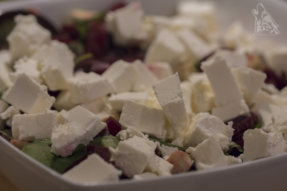 Najpierw przygotowujemy w miseczce sos łącząc wszystkie składniki. Dokładnie je mieszamy i pozostawiamy na chwilę, żeby smaki się „przegryzły”. W tym czasie zajmujemy się składnikami sałatki. Buraki kroimy na drobne, cienki kawałki.