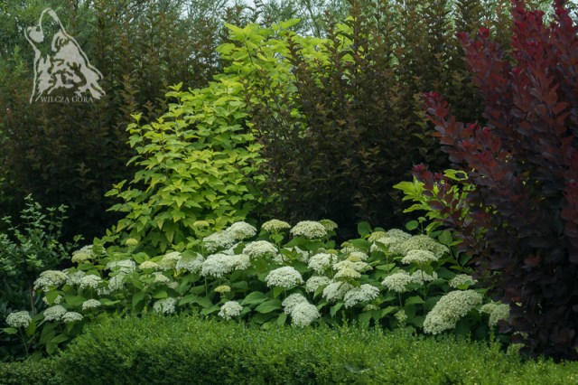 Mamy kilka miejsc w ogrodzie, gdzie prym wiodą nie tylko kolorowe, czy pachnące kwiaty. Liście o przepięknych kształtach, czy ciekawych kolorach mogą zdobić ogród w równie imponujący sposób. Upodobałam sobie szczególnie mariaż burgundowo-żółty. Oprócz soczystej zieleni, to moje 2 ulubione kolory dla liści roślin ozdobnych. Bardzo lubię je łączyć. Znakomicie się to udaje, kiedy mamy do dyspozycji krzewy pęcherznic i perukowców.