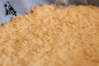 Po 30 minutach, ścieramy ciasto na przygotowaną blaszkę.