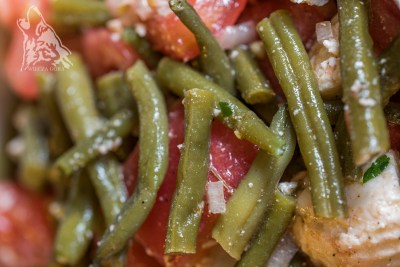 Pomidory pozbawiamy skóry (poprzez wyparzenie) i kroimy w 2 cm kostkę. Wrzucamy na fasolkę. Solimy je i pieprzymy do smaku. Kolejno dodajemy bardzo drobno pokrojoną cebulkę. Ser kroimy również w 2 cm kostkę i dodajemy do pozostałych składników. Całość posypujemy zieloną pietruszką i polewamy obficie oliwą z oliwek. Delikatnie mieszamy dużą łyżką. Dosalamy jeśli potrzeba. Jeśli mamy czas, można sałatkę odstawić na około 30 min. do lodówki. My zwykle nie dajemy rady czekać … To nasza ulubiona i jakże pyszna, letnia sałatka.