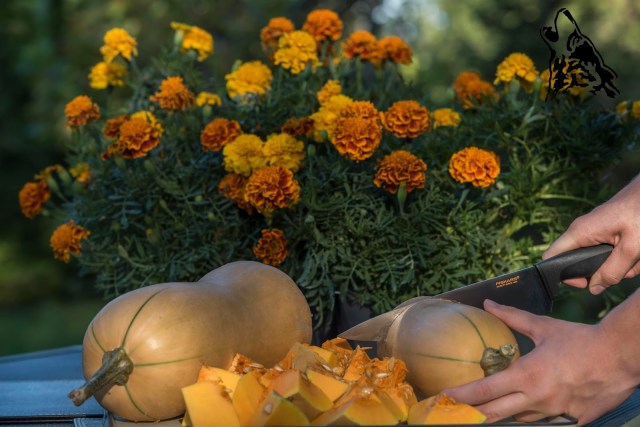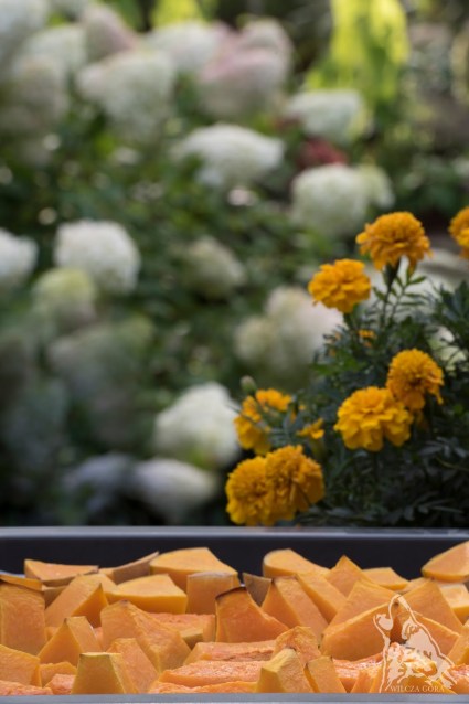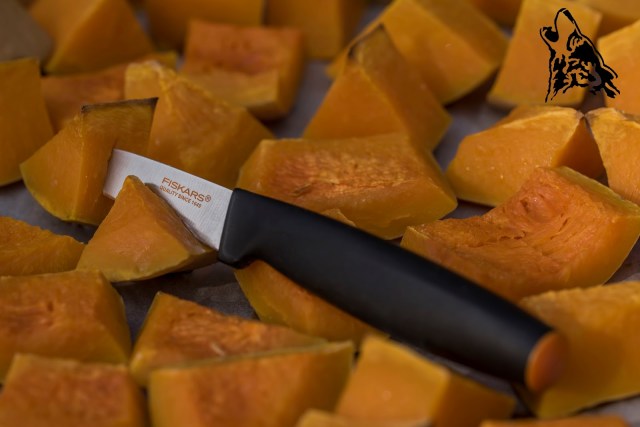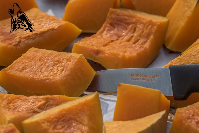 Dynię ze skórą kroimy na kawałki 3 x 3 cm.