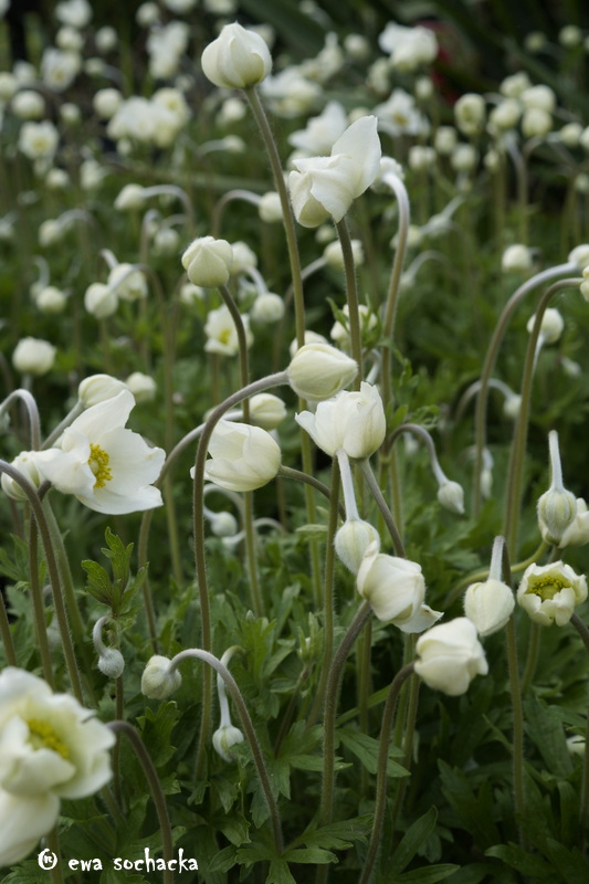 W półcienistych, wilgotnych miejscach posadziłam zawilce mieszańcowe.