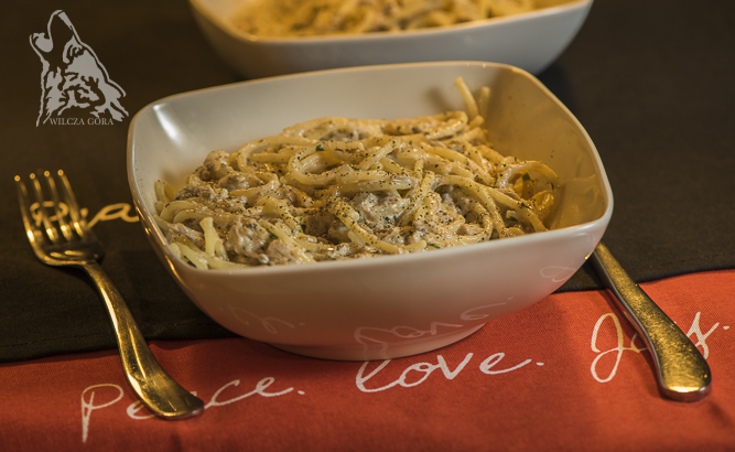 – 1 łyżeczka oregano, 1/2 łyżeczki gałki muszkatołowejPRZYGOTOWANIE:Makaron gotujemy w lekko osolonej wodzie, zgodnie ze wskazówkami na opakowaniu. Przed samym odcedzeniem makaronu, odlewamy szklankę wody z makaronu. Będzie ona bazą naszego białego sosu. Na patelni podsmażamy drobno pokrojoną cebulkę.Kiedy cebulka będzie już szklista, dodajemy kawałki tuńczyka i ser. Podsmażamy całość delikatnie mieszając.Posypujemy pieprzem, gałką i oregano. W misce obok mieszamy śmietanę, dodając po trochu wodę z makaronu.Dobrze połączone, wlewamy na patelnię. Solimy do smaku. Dodajemy makaron, całość dokładnie mieszamy, dodając orzeszki lub pestki słonecznika.ŻYCZĘ WAM WSZYSTKIEGO DOBREGOW TEN SZCZEGÓLNY DZIEŃ !NIECH BĘDZIE ŚWIATOWO,NIECH BĘDZIE MAKARONOWO !PEACE. LOVE. JOY. -